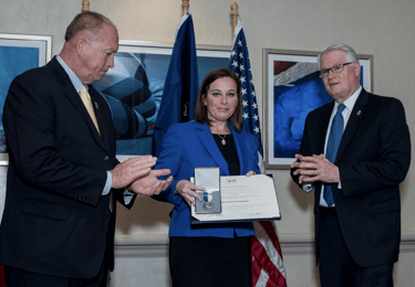 Above: Chief Joe Lawless, left, and Director Jay Grant, right, award a posthumously a 9/11 Police and Public Safety (IPM) Valor Medal to the widow of a fallen officer, Brent Thompson, who was killed in the line of duty at the Dallas DART Transit. Jay Chairs the 9/11 Center for Counterterrorism and Security.