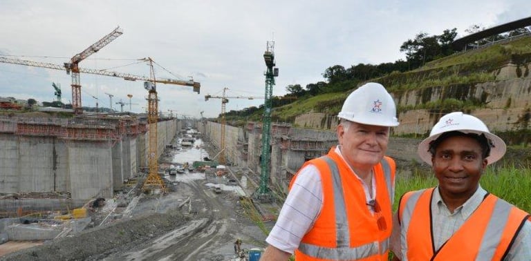 Security review at the new Pacific Panamax channel at Panama Canal, and in front of the new lock doors before being installed, pictured with Antiono Michel, Vice President of the Panama Canal. (2016)